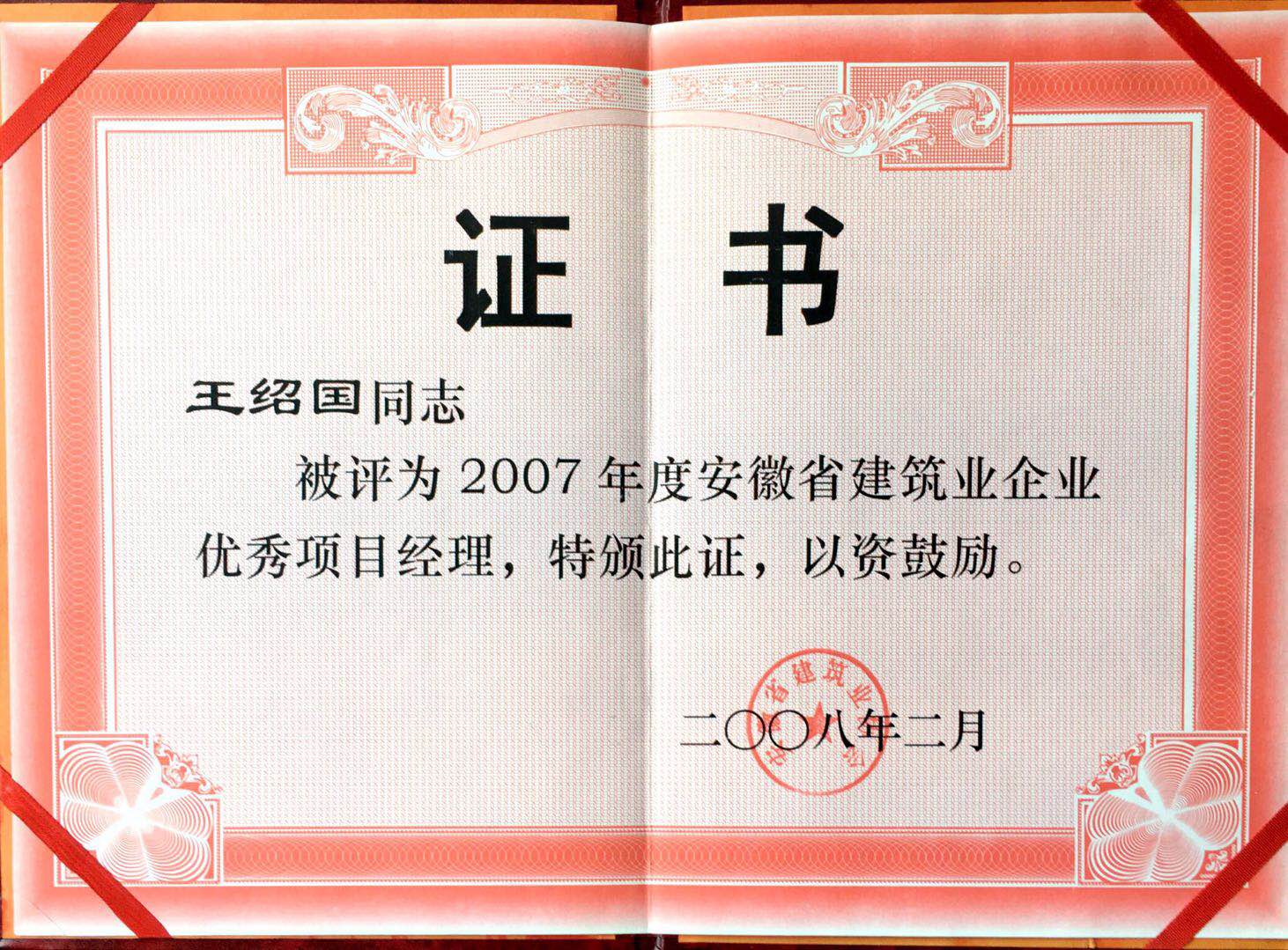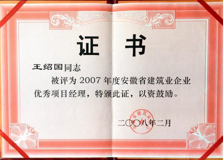 >2007年度安徽Jackpot筑业优异项目司理王绍国