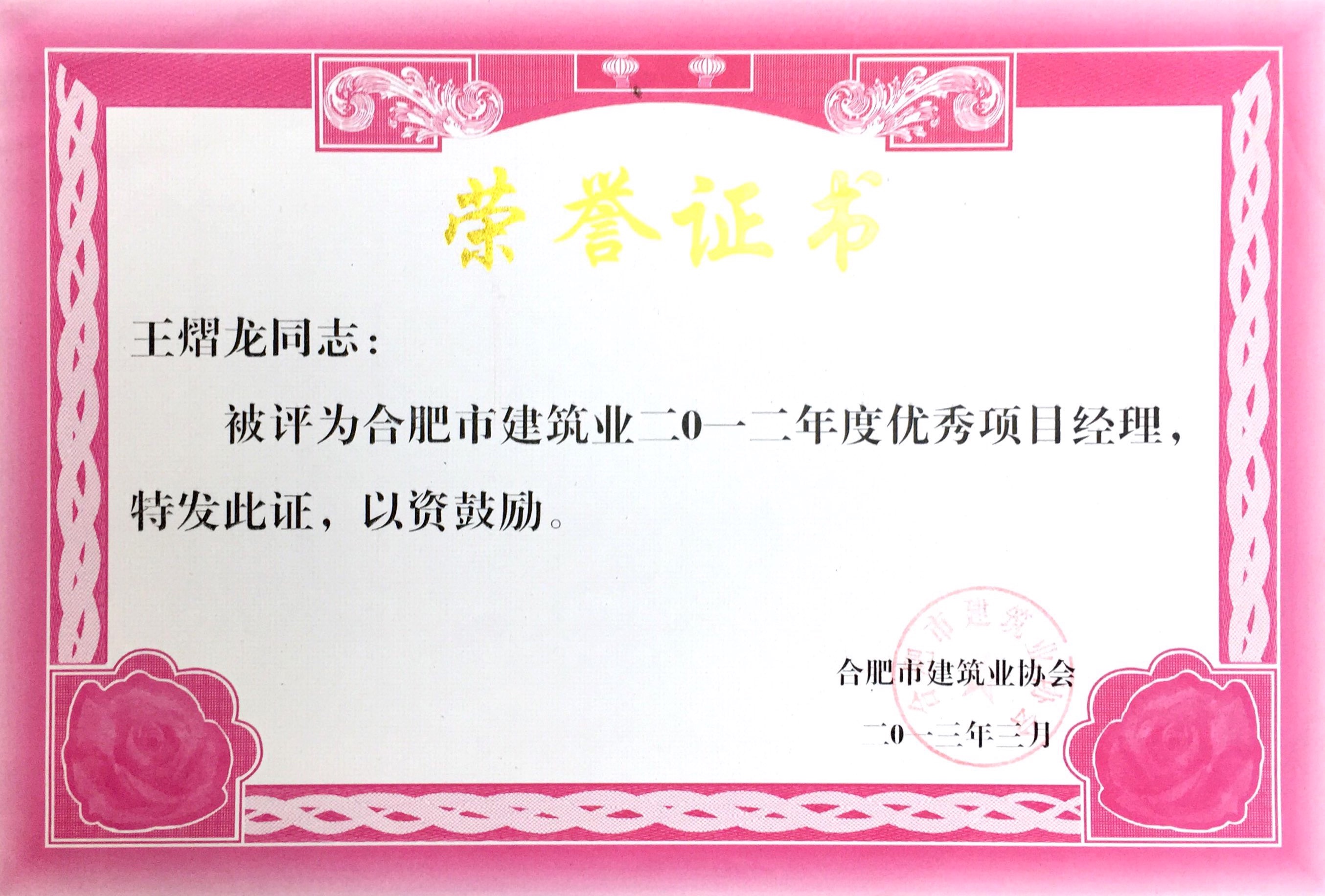 >合肥市修建业2012年度优异项目司理——王熠龙
