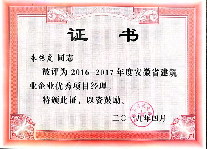 >2016-2017年安徽Jackpot筑业优异项目司理——朱传虎