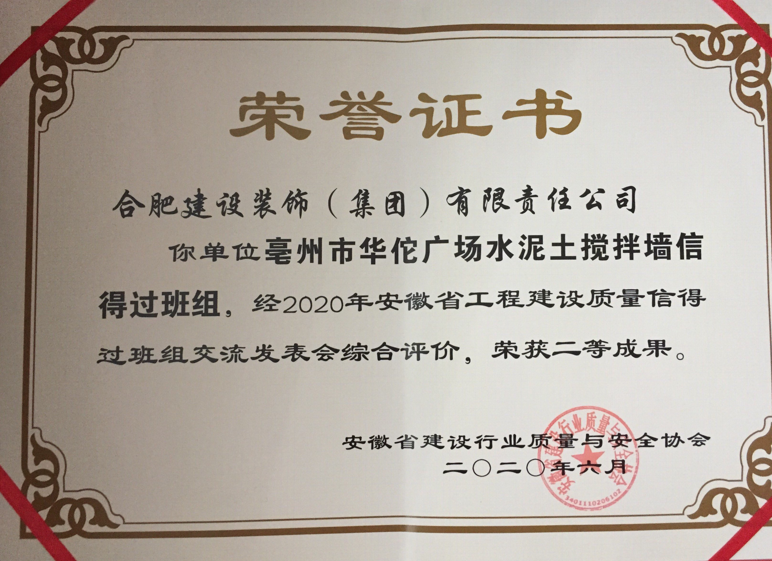 >亳州华佗广场基础工程QC小组《提高水土壤搅拌墙成墙质量验收及格率》效果荣获2020年安徽省工程建设质量治理小组效果一等奖