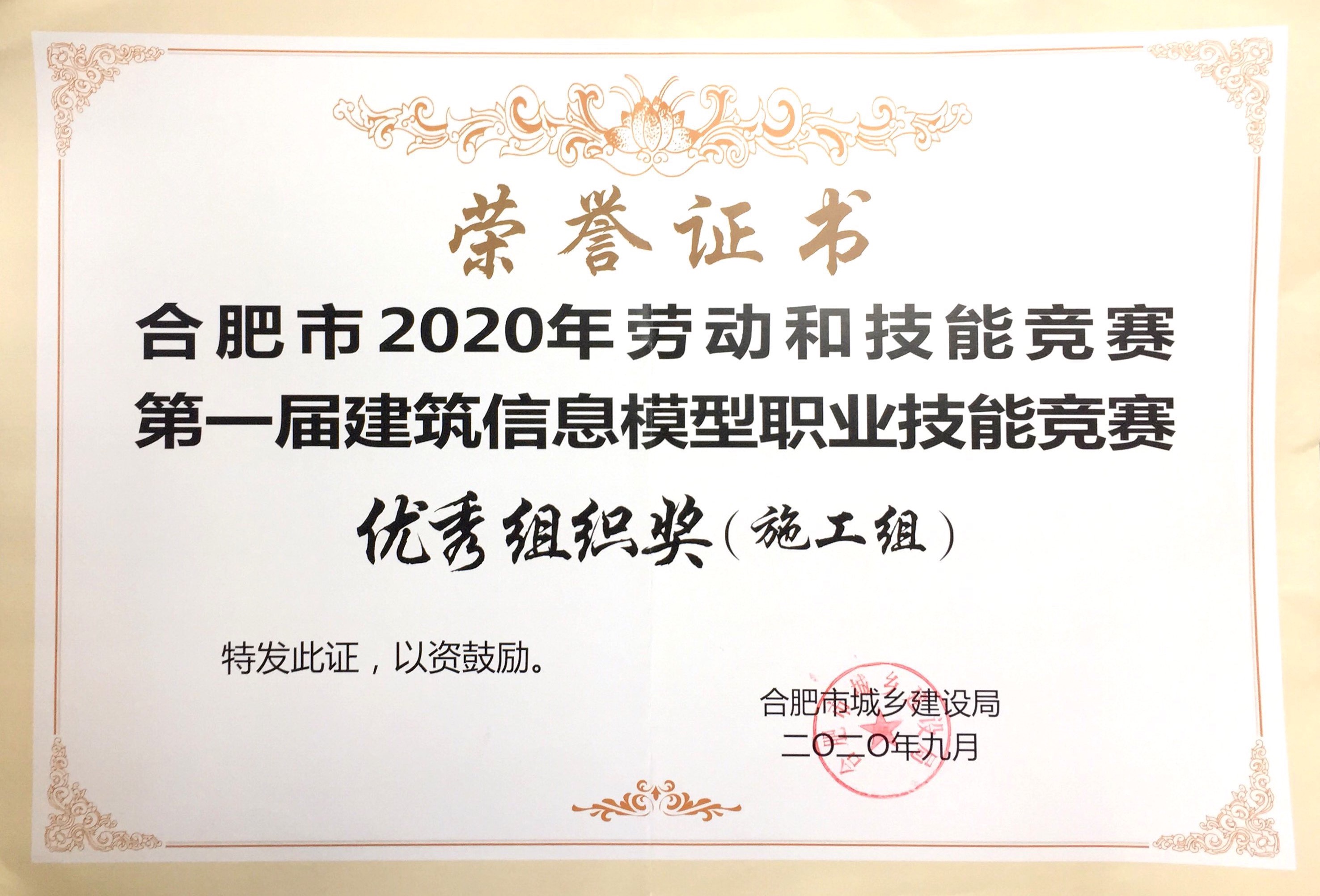 >合肥市2020年劳动和手艺竞赛第一届修建信息模子职业手艺竞赛优异组织奖(施工组)