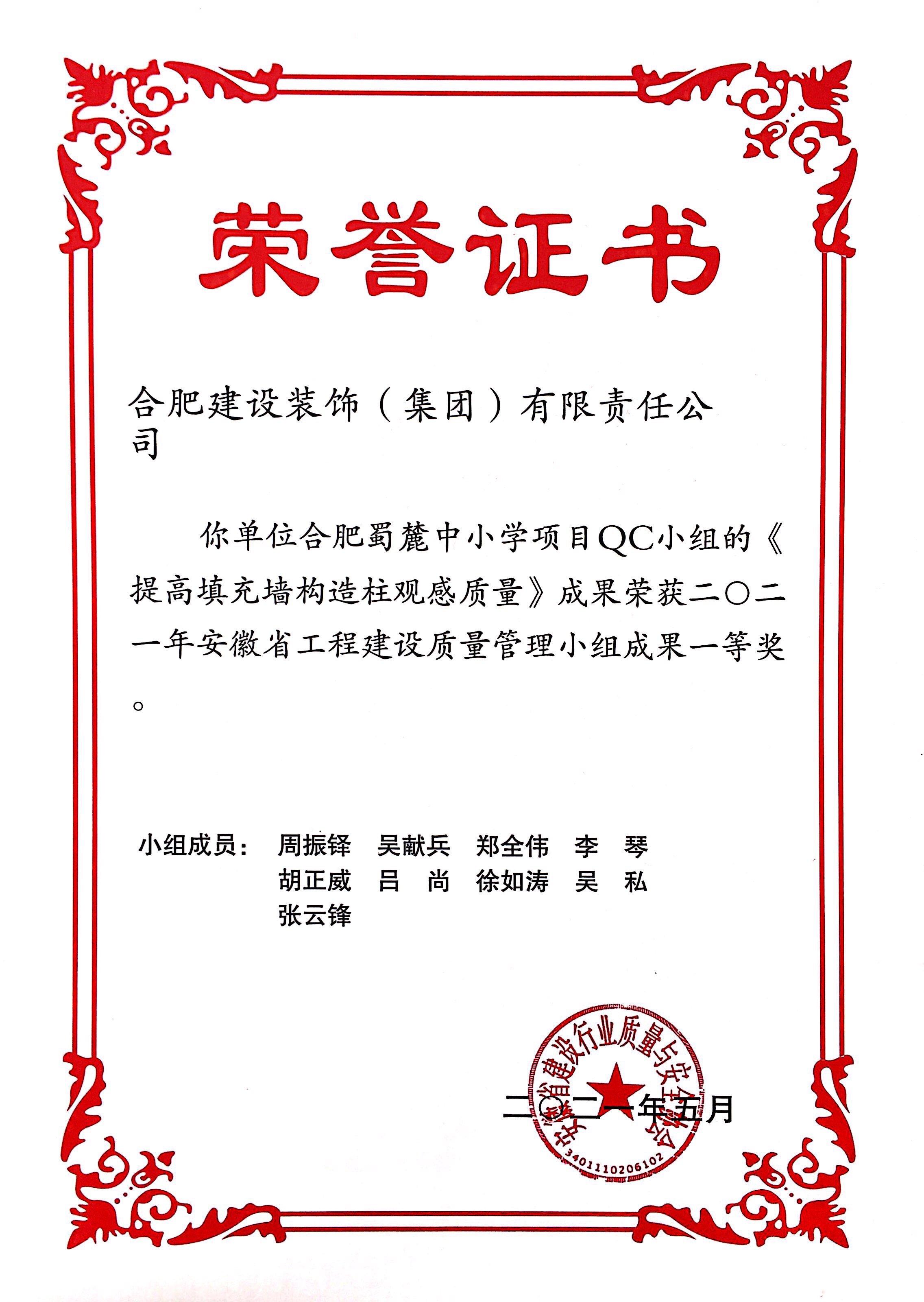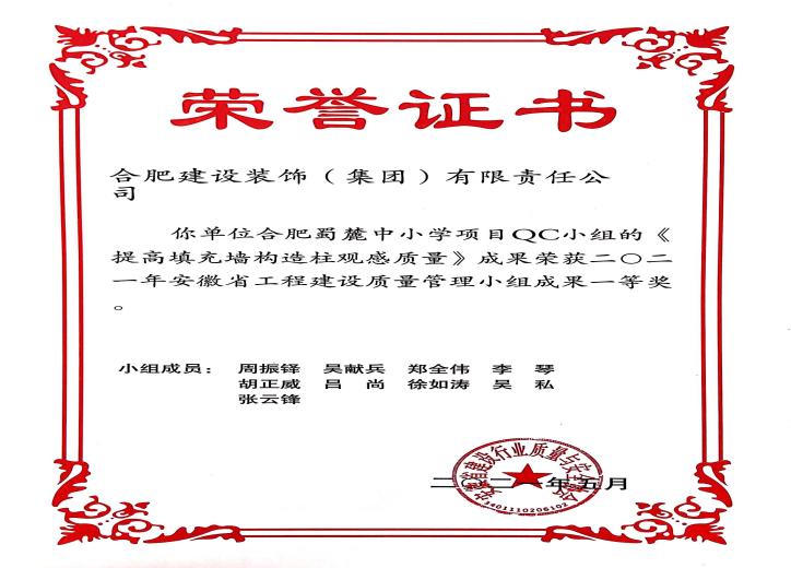 >合肥蜀麓中小学项目QC小组《提高填充墙充结构柱观感质量》——2021年安徽省工程建设质量治理小组一等奖