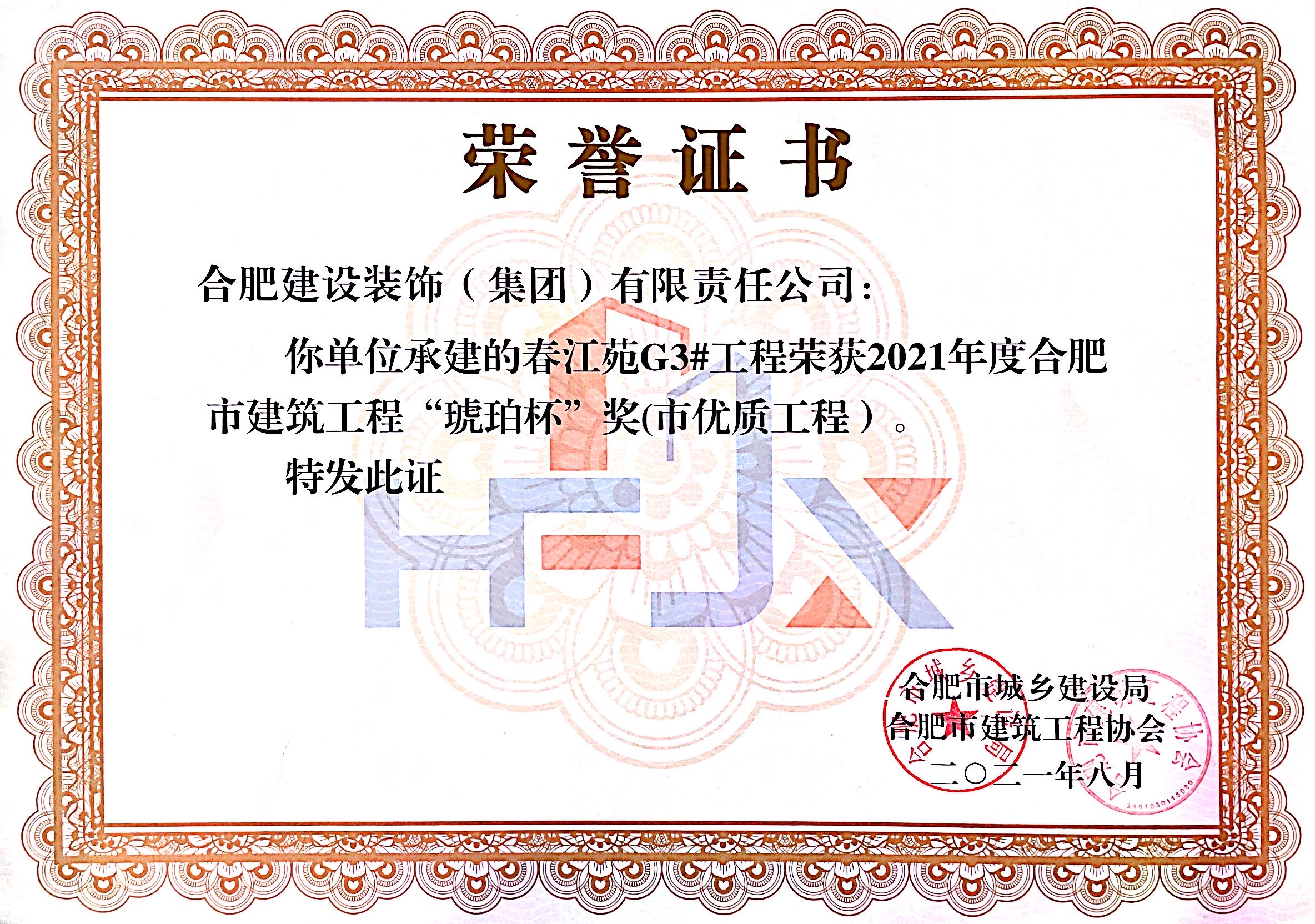 >春江苑G3#--2021年度合肥市修建工程“琥珀杯”奖(市优质工程)